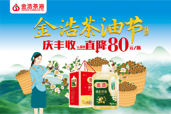 為慶祝金浩示范油茶基地大豐收,同時推動高品質(zhì)茶油走進千家萬戶,金浩集團將于12月起舉辦“金浩茶油節(jié)”主題活動,原價基礎(chǔ)上5L純茶油產(chǎn)品單瓶直降80元,在最大程度上讓利消費者。